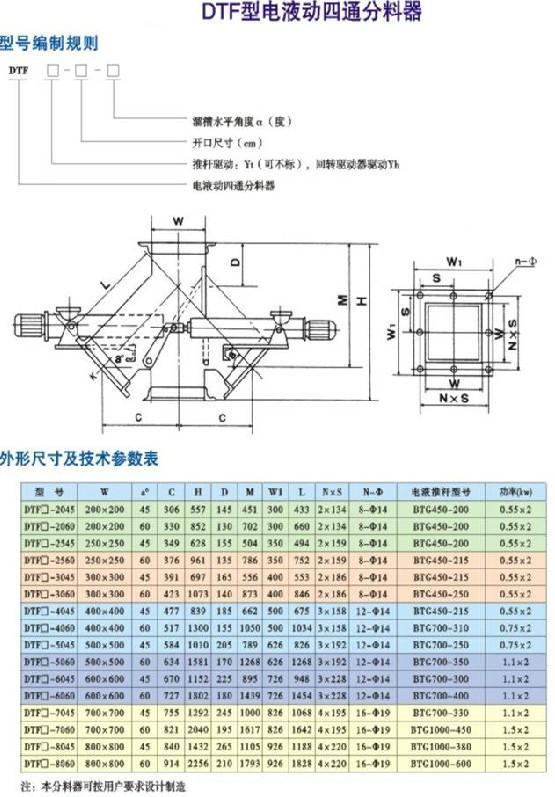 四通分料器主要由閥體、閥軸、閥板、曲柄機構(gòu)、電液推桿等組成,工作時電液推桿的直線往復(fù)運動通過曲柄帶動閥軸、閥板作一定角度的擺動,從而輸送物料、控制物料的流向及流量。 DTF型電液動四通分料器采用優(yōu)質(zhì)碳素鋼板焊接結(jié)構(gòu)、具有體積小、總量輕、阻力小等特點。采用電液推桿驅(qū)動,運行平穩(wěn)、故障率低、可以快速切換物料流向,也可以接受調(diào)節(jié)或變送單元信號進(jìn)行自動控制。四通分料器是我公司根據(jù)市場需要開發(fā)的系列產(chǎn)品,是物料輸送系統(tǒng)中實現(xiàn)物料快速換向的理想設(shè)備,廣泛應(yīng)用于建材、冶金、礦山、輕工、電力、糧食等行業(yè)固體顆粒和粉狀物料的輸送。